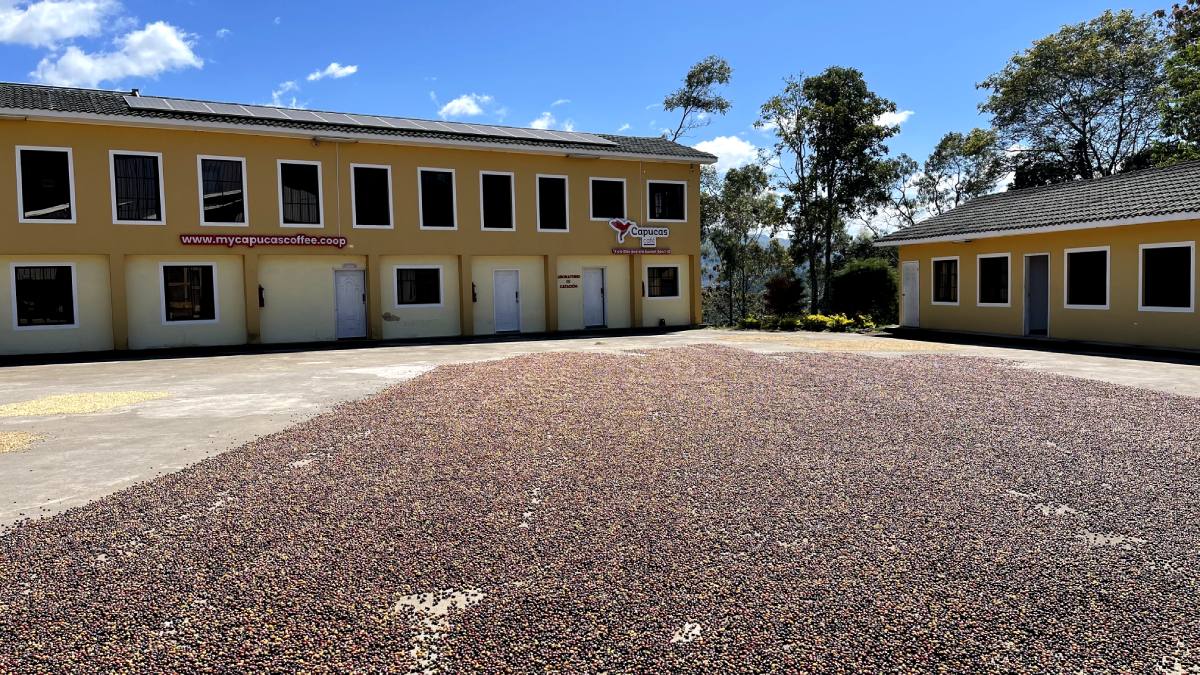 Capucas es un gran complejo de varios edificios entre numerosas fincas pequeñas. El edificio principal recuerda a una típica plaza latinoamericana, una plaza rodeada de oficinas, una tienda, un restaurante y una sala de reuniones, y el corazón productivo de la cooperativa: la tostadora de café de metal y cemento, de aspecto industrial.
