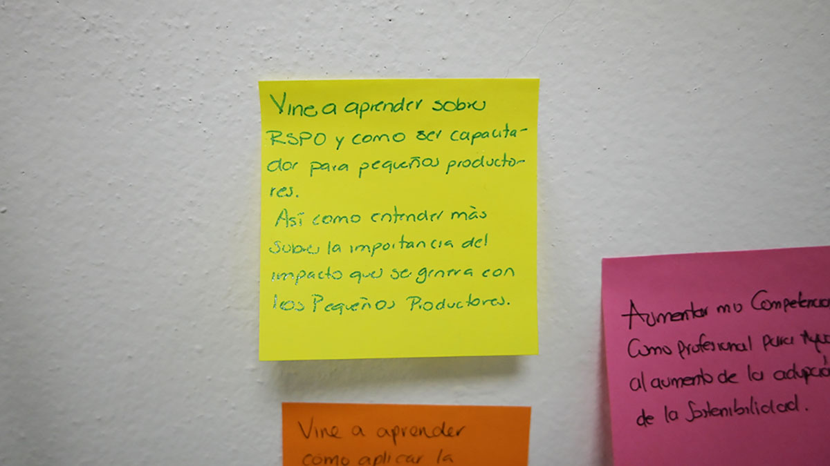 Una de nuestras expectativas es que podamos continuar interactuando entre el grupo y esperamos salir de aquí con una red que nos permita continuar intercambiando ya sea inquietudes, experiencias, dudas y que esto también nosotros como RSPO nos mantenga en contacto con esos participantes, no solo para saber qué están haciendo sino para apoyar y poder tener un mejor conocimiento de los diferentes países donde se están desarrollando estos procesos de acompañamiento a grupos de pequeños productores