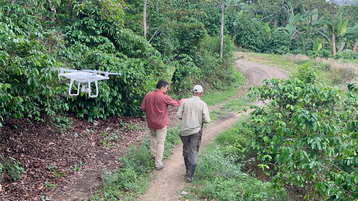 Demostración de pilotaje del dron en beneficio de café en El Paraíso, Honduras