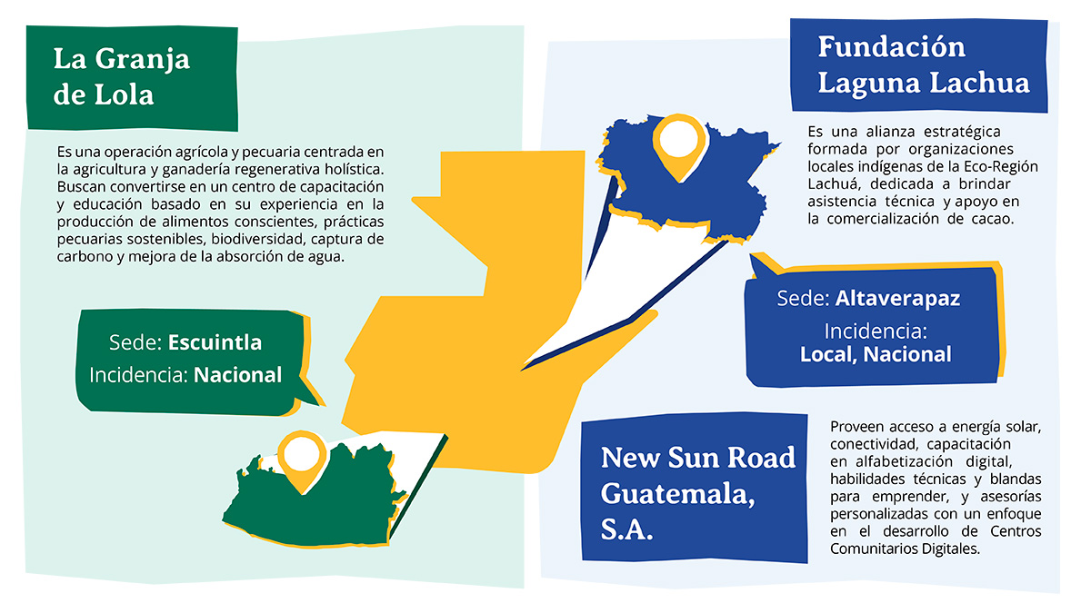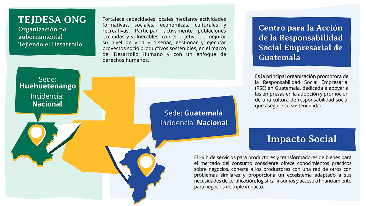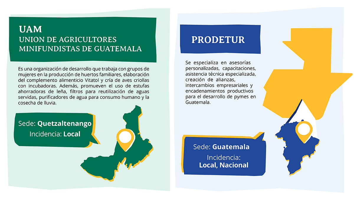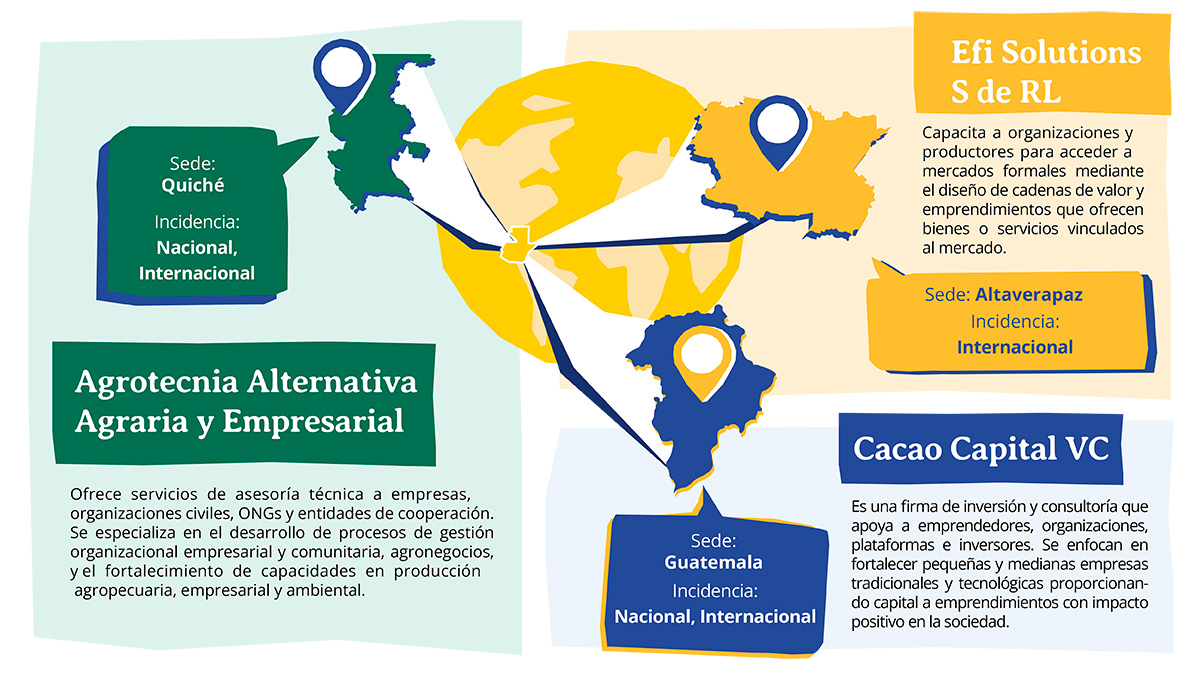 Durante el proyecto, se contó con la participación de 14 OAEs, entre ellas aceleradoras, asesores empresariales, organizaciones sin fines de lucro, microfinancieras, inversionistas y gremiales. La zona de impacto geográfico incluyó Huehuetenango, Quiché, San Marcos, Quetzaltenango, Alta Verapaz y Ciudad de Guatemala.