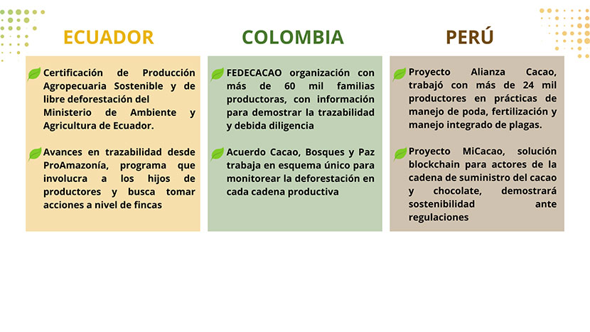En estos espacios, los participantes manifestaron sus avances y retos en relación al cumplimiento de las regulaciones internacionales, y  establecieron la necesidad de continuar la discusión con el fin de encontrar soluciones concretas, reales y oportunas sin perder de vista a los pequeños productores, quienes a través incentivos, financieros y no financieros, mejorarán sus prácticas sostenibles lo que permitirá mejorar su calidad de vida y conservar los bosques de nuestra Amazonía.