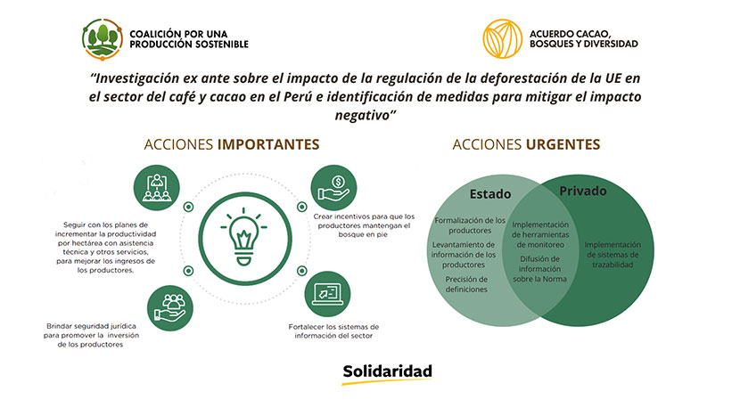 Solidaridad, organización que trabaja en el desarrollo de cadenas de valor inclusivas y sostenibles. A través del Acuerdo Cacao Bosques y Diversidad, busca posicionar el cacao peruano como de alta calidad, de origen único, sostenible y libre de deforestación. Este año, frente a la promulgación de la norma europea, el  Acuerdo ha actualizado su Plan de Acción al 2026 y recientemente ha presentado los resultados de la publicación “Monitoreo de Bosque Primario y Purma: usando imágenes de satélite Sentinel-2 en fincas de café” que desarrolló una metodología piloto que permite conocer la dinámica de la cobertura de fincas de agricultores intervenidos en el año 2018 y compararlas con años posteriores.