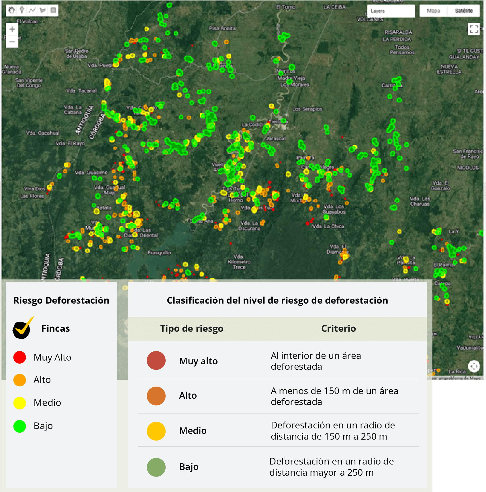 Los resultados del análisis ofrecen una lectura positiva y alentadora para la cadena de valor del cacao en Córdoba. En primer lugar, la información del Instituto de Hidrología, Meteorología y Estudios Ambientales (IDEAM) –que constituye la referencia nacional para la gestión de bosques y cambio de cobertura– indica que no existen niveles de riesgo alto o muy alto en la gran mayoría de las áreas analizadas, lo que permite inferir que las fincas cacaoteras no están asociadas a procesos recientes de deforestación.