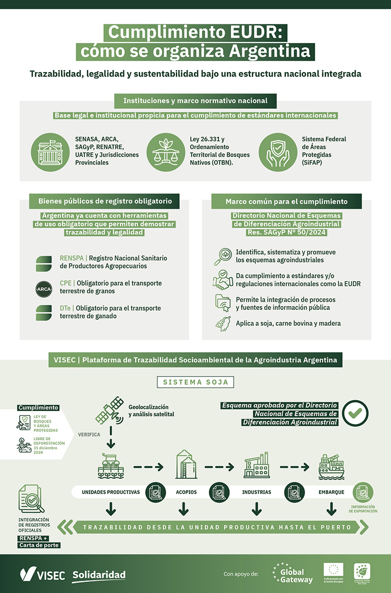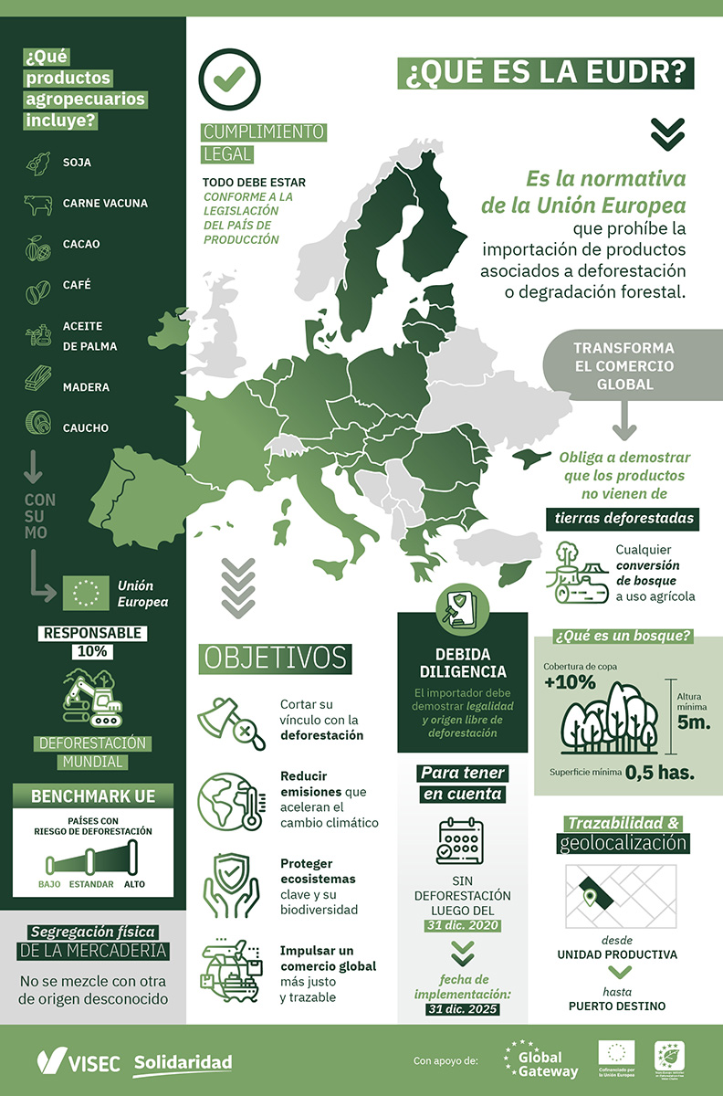 En el ámbito del Mercosur, Solidaridad implementa el proyecto SAFE (Agricultura Sostenible para Ecosistemas Forestales), que es parte de la Iniciativa del Equipo Europa sobre Cadenas de Valor Libres de Deforestación. Durante los eventos realizados entre 2024 y 2025 para la difusión del nuevo Reglamento de la Unión Europea, hemos recolectado las principales inquietudes de los productores de soja y ganadería en Argentina en términos de impacto del Reglamento, cumplimiento de trazabilidad y debida diligencia, herramientas nacionales existentes y la plataforma VISEC, y las hemos sistematizado en un documento de preguntas frecuentes (FAQ EUDR) que esperamos les sea de utilidad.
