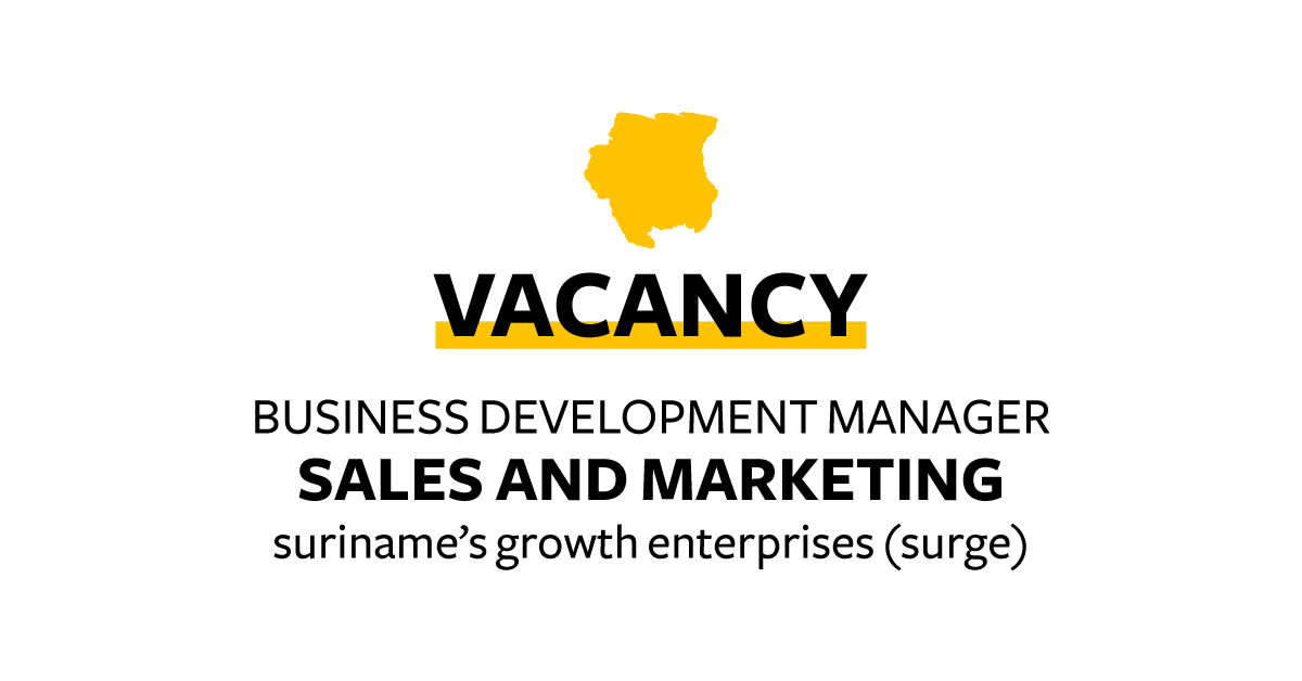 Solidaridad seeks local candidates for the role of Business Development Manager – Sales and Marketing on an anticipated Program for Suriname’s Growth Enterprises (SURGE), under the Ministry of Economic Affairs, Entrepreneurship and Technological Innovation (MEA). The project will support growth-oriented enterprises in Suriname through a combination of business development services and matching grants for productivity-enhancing investments and (supply) value chain development.
