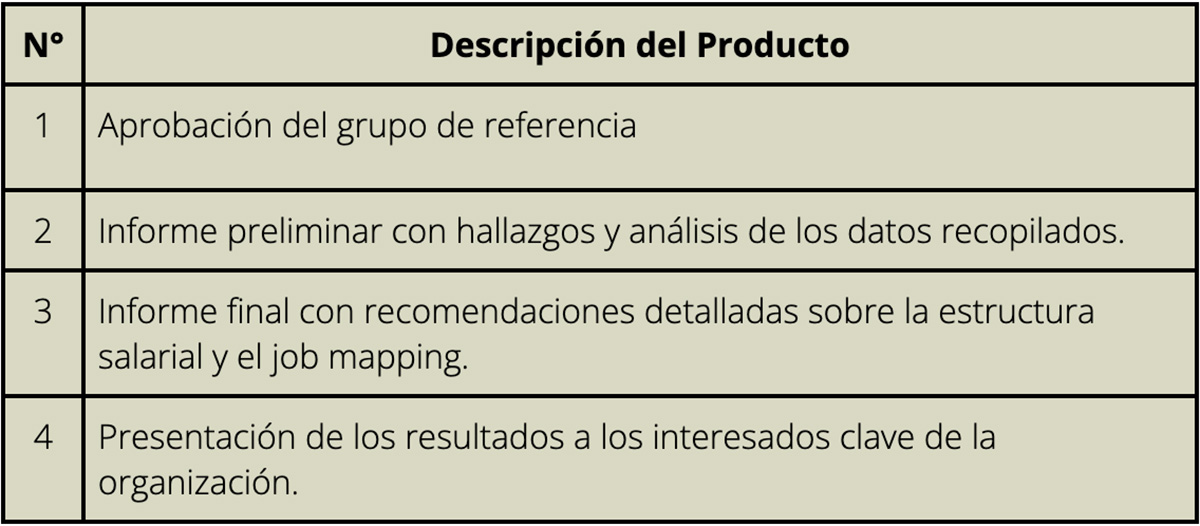 - Informe final con recomendaciones detalladas sobre la estructura salarial y el job mapping.